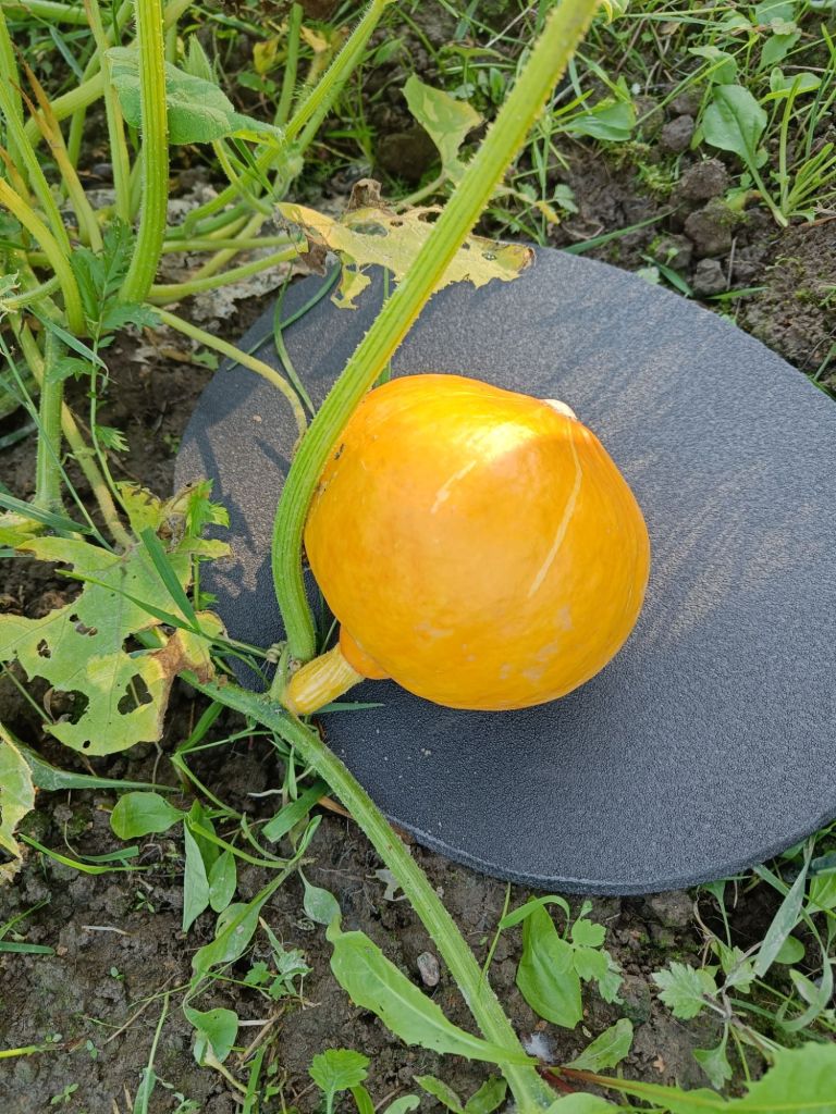 Hokkaidokurpitsa tykkää savesta, vesisateesta, helteestä, ja rikkaruohopaperin alle pesän tehneet muurahaisetkin ovat näköjään ihan ok.