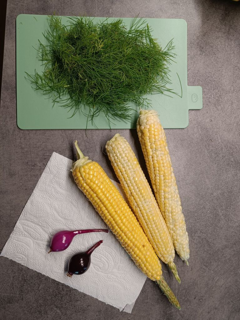 Vähän piti korjata satoa, koska tilli oli alkanut kellastua. Maissien kanssa oltiin vähän fifti-siksti syömiskelpoisuuden kanssa. Punasipulilla ei myöskään pitkälle pötkitä.