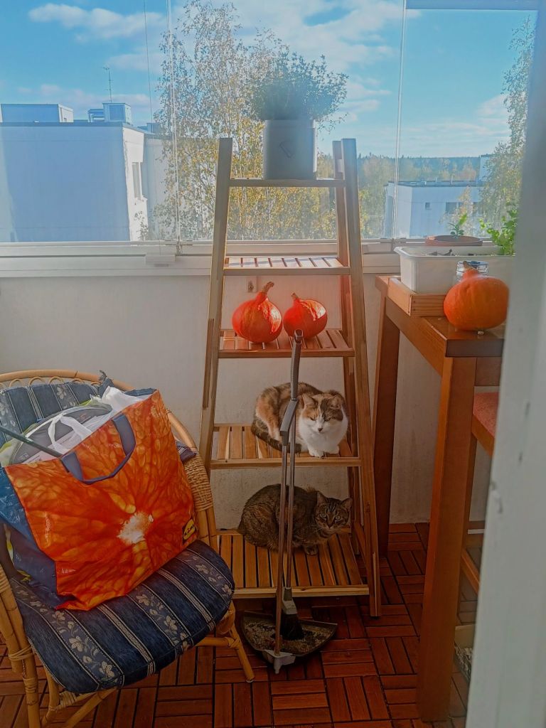 Timjamia, hokkaidoja, kissoja, ja viereen mahtuu kassillinen pellolta palanneita ja siivousta odottavia peltotavaroita. Pöydällä on yksi Reko-hokkaido, etteivät lopu kesken.