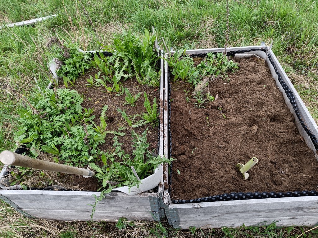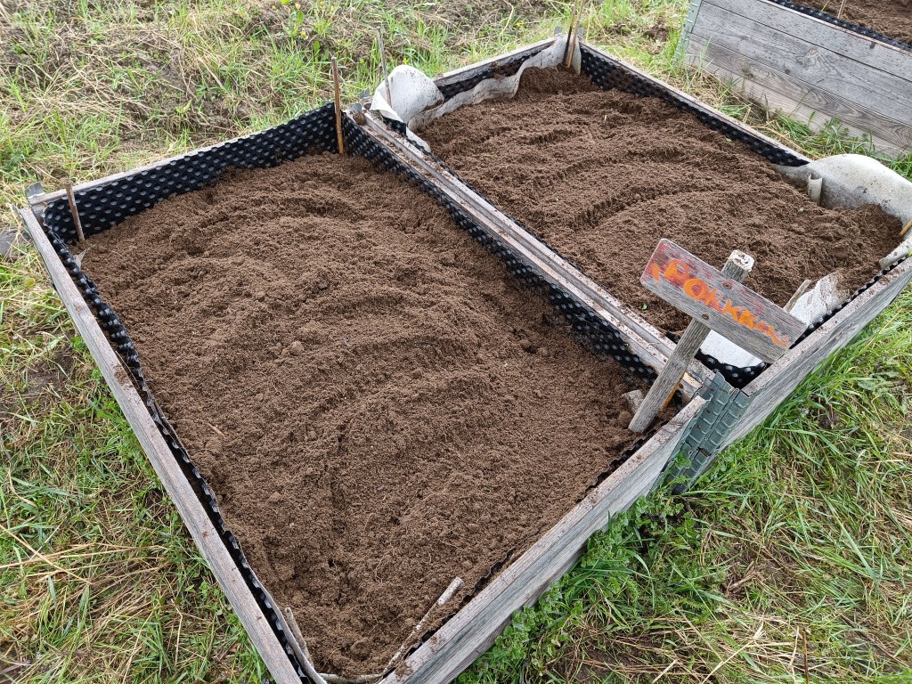 Kysymyksistä huolimatta, ei muuta kuin reippaasti toimeen. Kaivamista, kastelemista, kanankakkaa, varastolannoitetta, vakoja, vettä, ja kylttejä ja tikkuja rivin merkiksi. Ensimmäisessä laatikossa samettikukat, kesäkurpitsa, retiisiä, rosmariini ja kiinalainen ruohosipuli. Toisessa laatikossa lisää samettikukkia, lahjoitussipulia, porkkanaa ja tilliä.