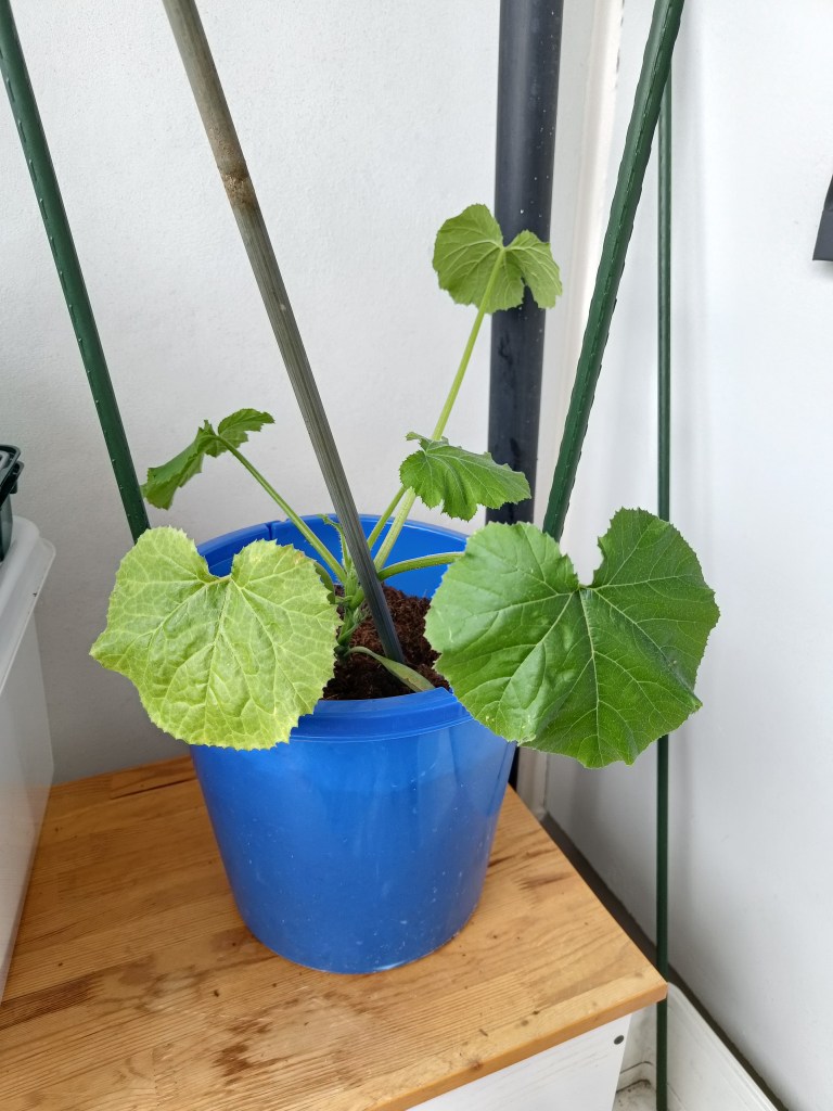 Hold my beer, totesivat kesäkurpitsa ja kurkku, itivät, ja alkoivat kasvaa. Olipa onneksi tyhjä sininen ämpäri (koska ikinä ei tiedä mihin sellaista tarvitsee), joka täytettiin mullalla ja johon pieni taimikaksikko sitten lykättiin.