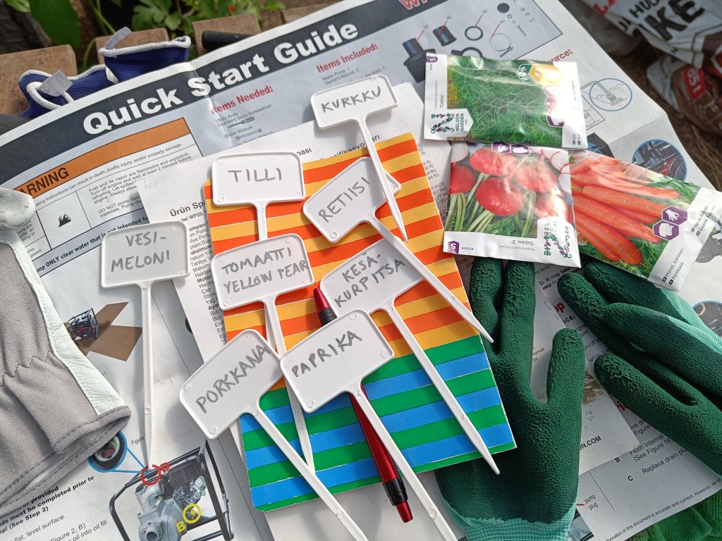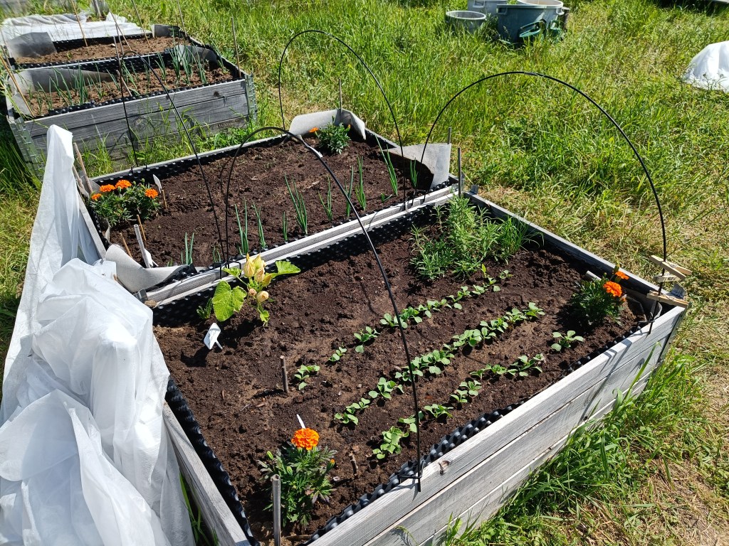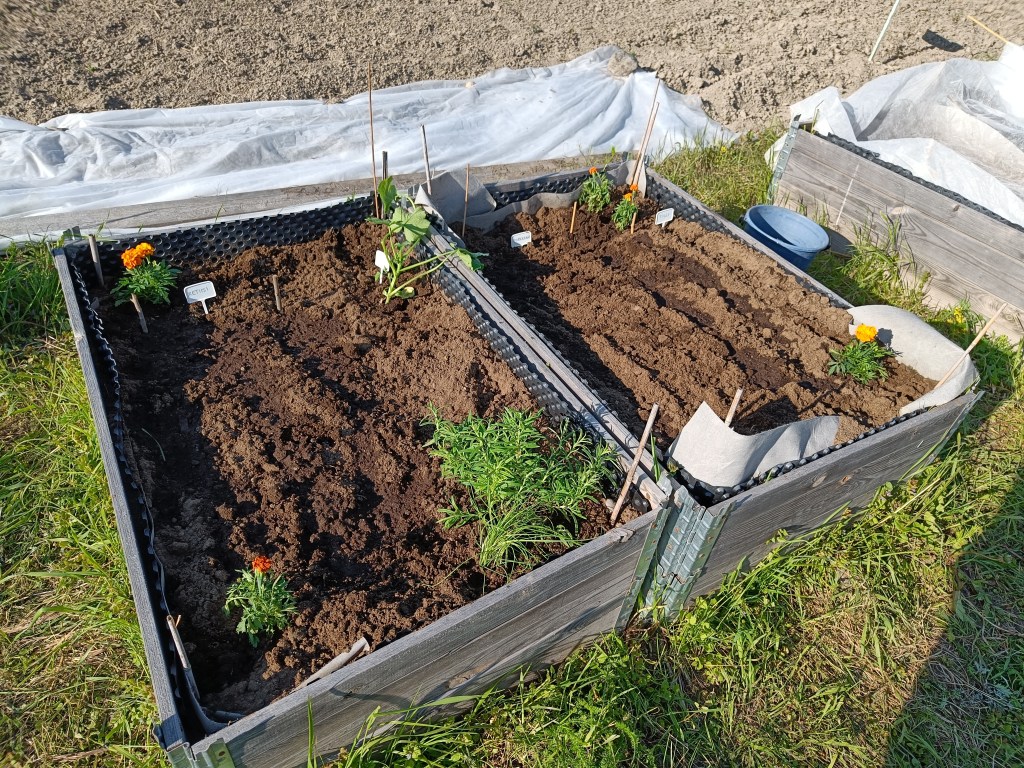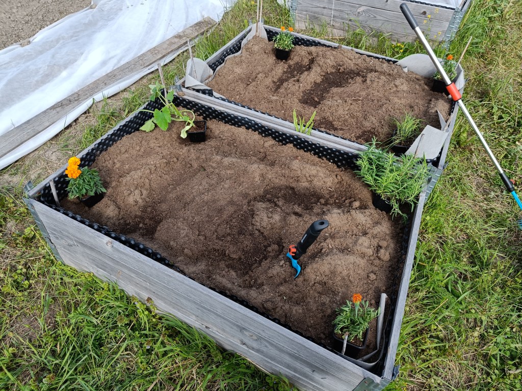 Kysymyksistä huolimatta, ei muuta kuin reippaasti toimeen. Kaivamista, kastelemista, kanankakkaa, varastolannoitetta, vakoja, vettä, ja kylttejä ja tikkuja rivin merkiksi. Ensimmäisessä laatikossa samettikukat, kesäkurpitsa, retiisiä, rosmariini ja kiinalainen ruohosipuli. Toisessa laatikossa lisää samettikukkia, lahjoitussipulia, porkkanaa ja tilliä.