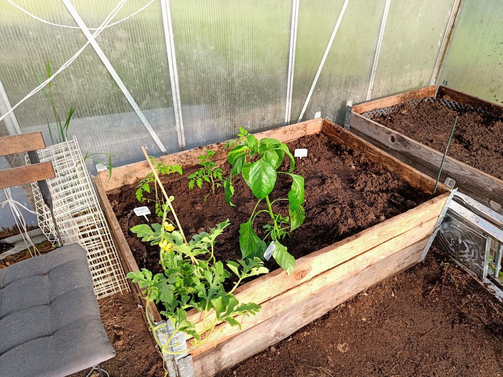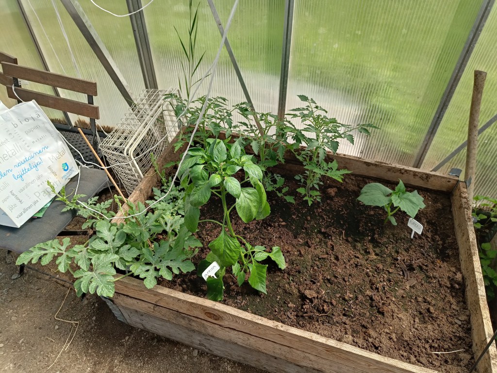 Kasvihuoneessakin voitiin hyvin. Tomaateista piti poistaa ensimmäiset varkaat, paprikan varren alaosan lehdistä piti kysyä kokeneemmalta kollegalta. Ei ole kuulemma itse poistanut vaan antanut kasvaa, joten olkoot siellä.