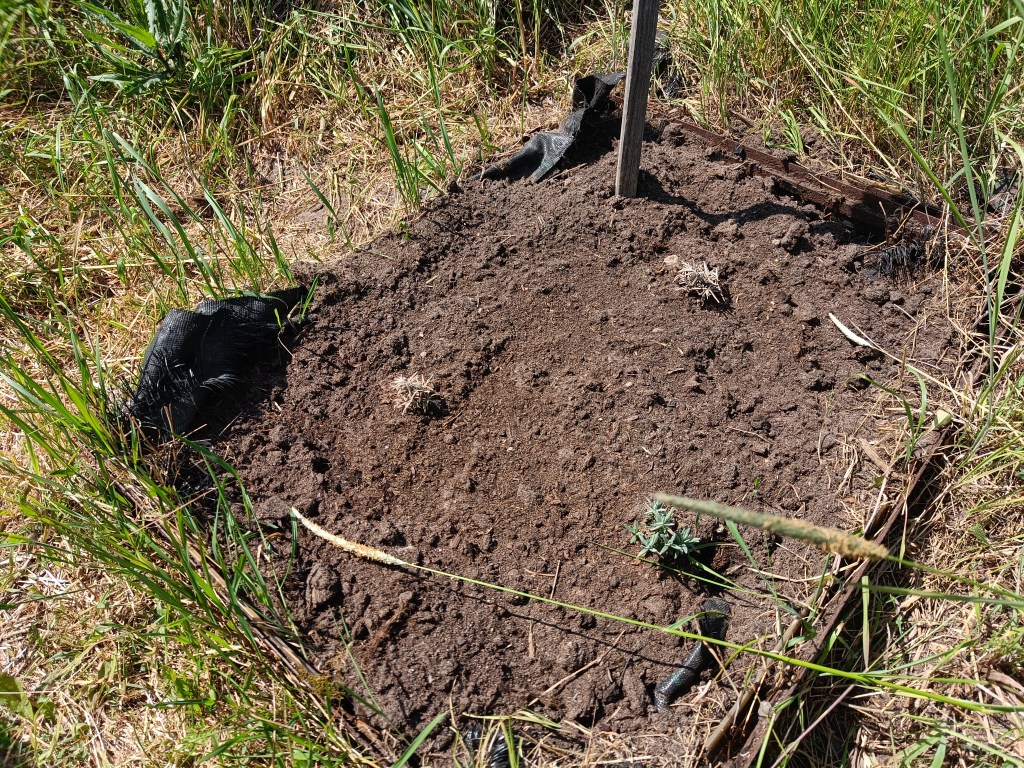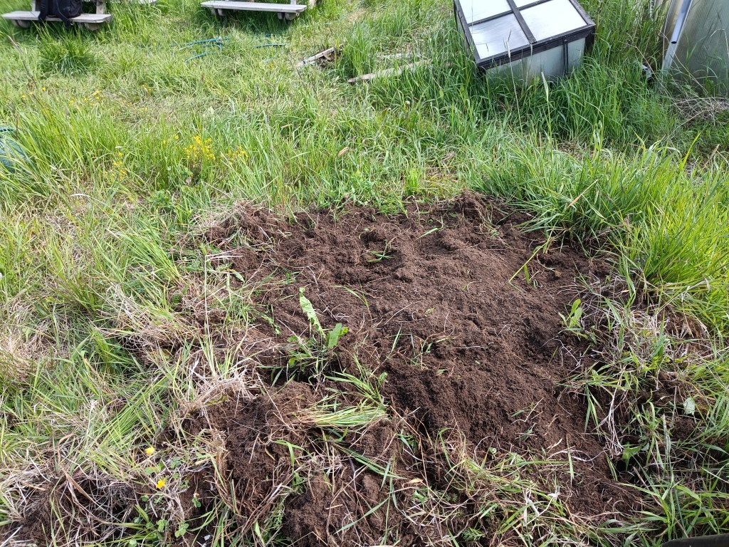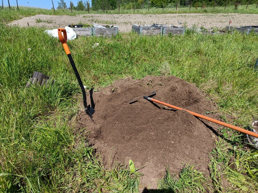 Se kuinka syvältä piti kaivaa, vaihteli 20 sentistä ”kahteen lapion syvyyteen” ja itse menin ehkä lähemmäs tuota jälkimmäistä. Monttu syntyi lapiolla, multa käytiin läpi talikolla, haravalla, lapiolla uudestaan, pienellä viljelylaatikkoon tarkoitetulla haralla, talikolla ja haravalla ja haralla. Toisto oli opintojen äiti. Eli varmasti sinne jäi joku juurenpätkä ja viereiset heinät ainakin tulevat kylään.