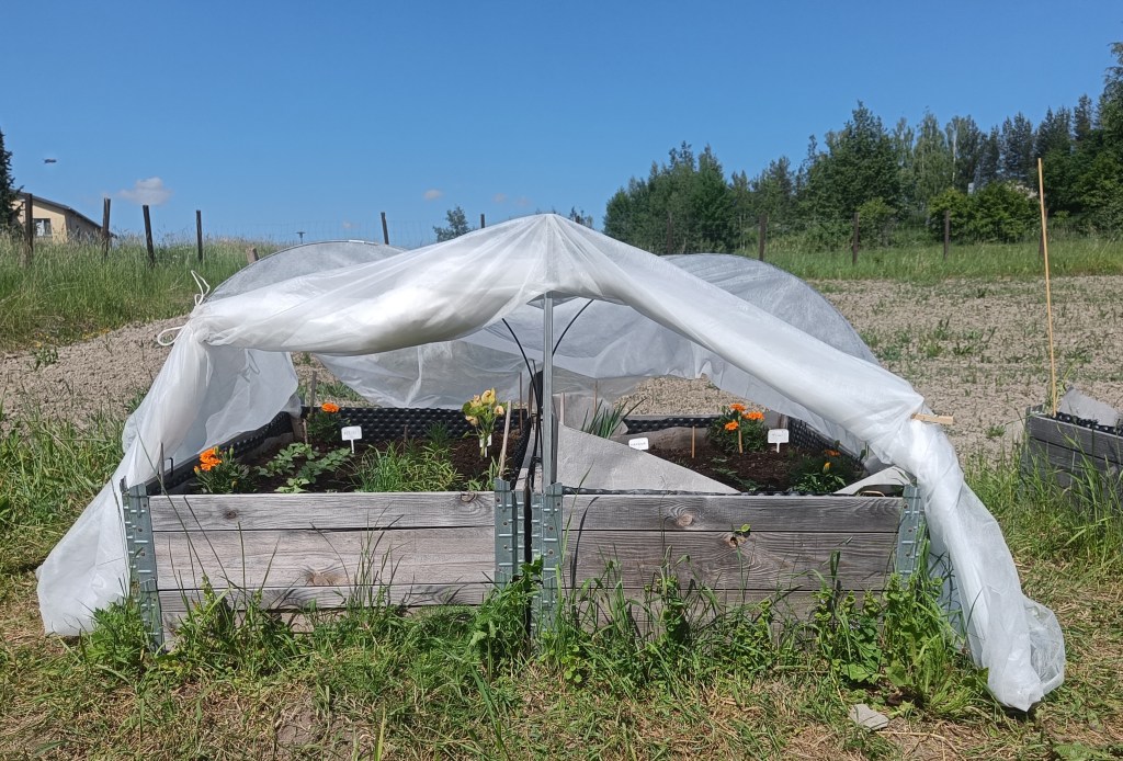 Nyt oli myös aika muuttaa hallaharsotus auringonvarjoksi. Tästä kävin keskustelua ex-kollegan kanssa, jolla on siirtolapuutarhamökki. Tekisi nyt siitäkin blogin, sitä olisi kiva lukea. Vinkvink. Nyt aletaan olla siinä vaiheessa kautta, missä tiukka harsotus saattaa aiheuttaa pienten kasvinalkujen paahtumisen helteessä. (Samaa ongelmaa myös puutarhurinalulla itsellään.) Kesäkurpitsakin alkaa harkita kukkiensa avaamista. No, jos tuholaiset syövät kasvatit niin niin siinä sitten käy. Ja kirpoilta ei kuulemma pysty suojautumaan vaikka kuinka harsottaisi. Joten ei muuta kuin auringonvarjoa tekemään.