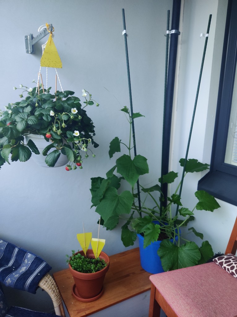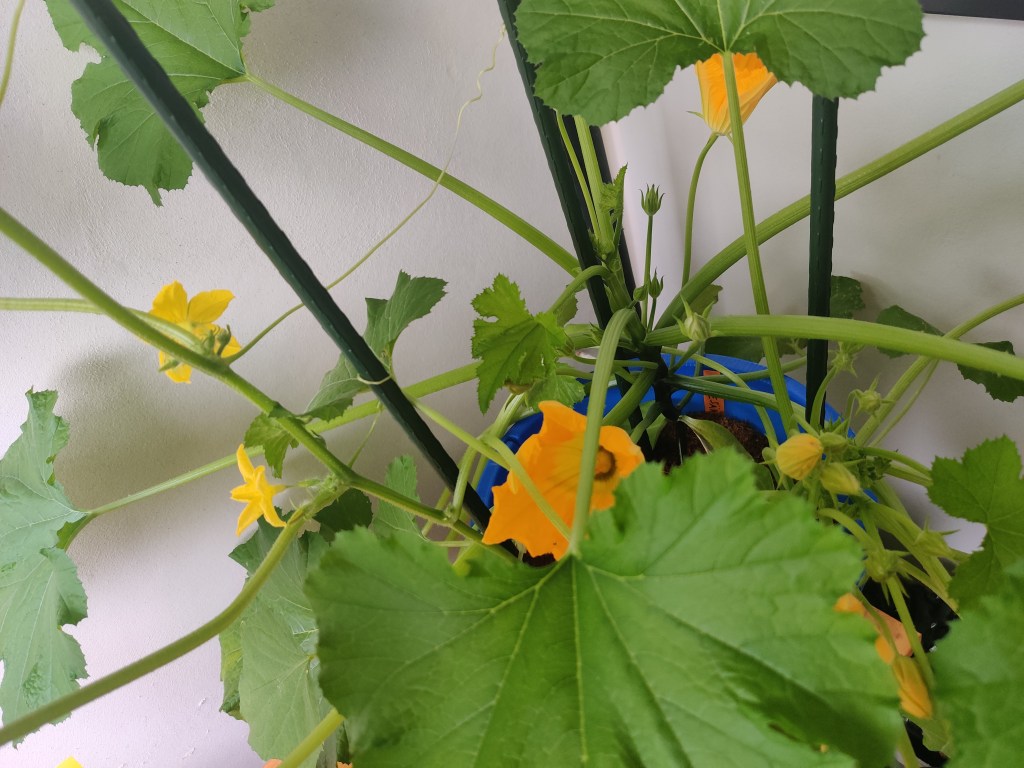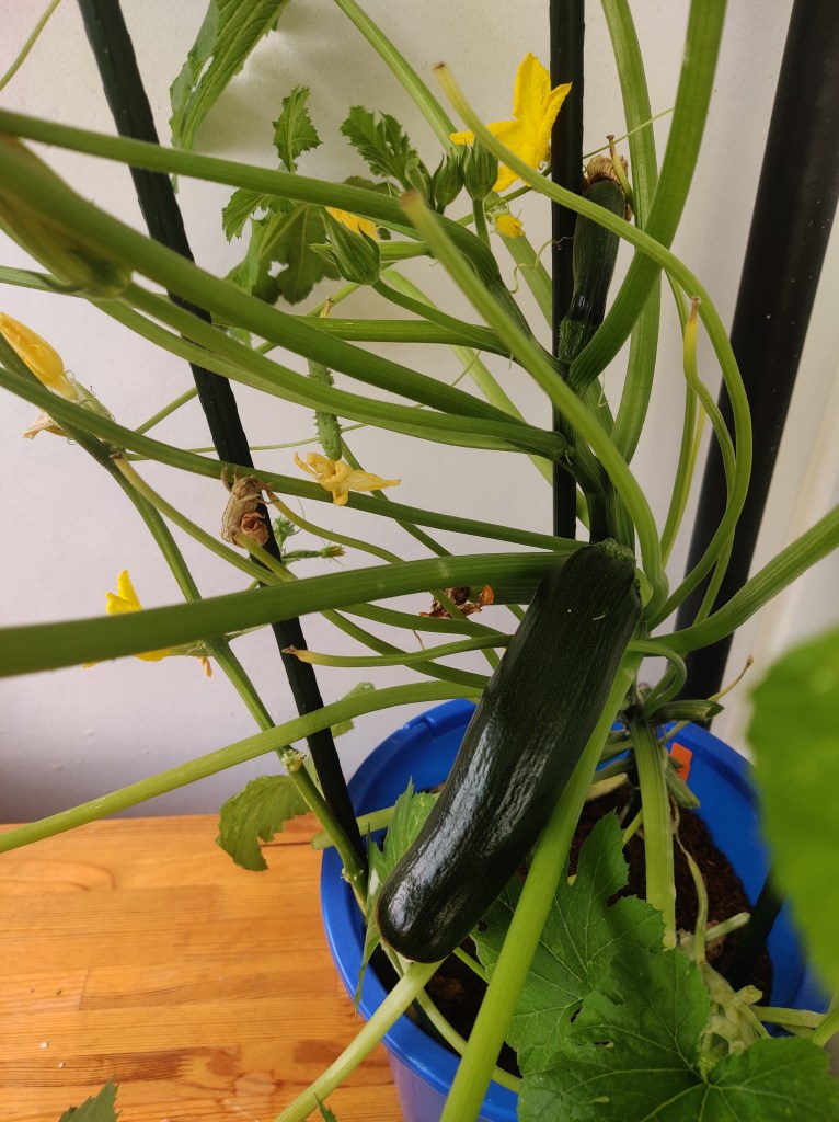 Toinenkin kesäkurpitsa sinisen ämpärin kasviimme kehittyi, mutta jäi kovin pieneksi. Kurkku teki vain parin sentin mittaisia alkuja ja jossain vaiheessa poistettiin ämpäristä. Kasveja myös katkottiin raa’asti latvoistaan kun alkoi parvekkeen mitta loppua kesken. Ei näyttänyt haittaavan. Harmi kun ei ole tullut vastaan kuvaa kasvuston ollessa suurimmillaan.