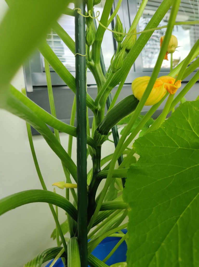 Kesäkurpitsa kasvoi reippaasti ja meistä oli kauhean hauska seurata kasvun ihmettä lähietäisyydeltä, olkoonkin että lasitettunakin parveke alkoi jo vähän viilentyä.