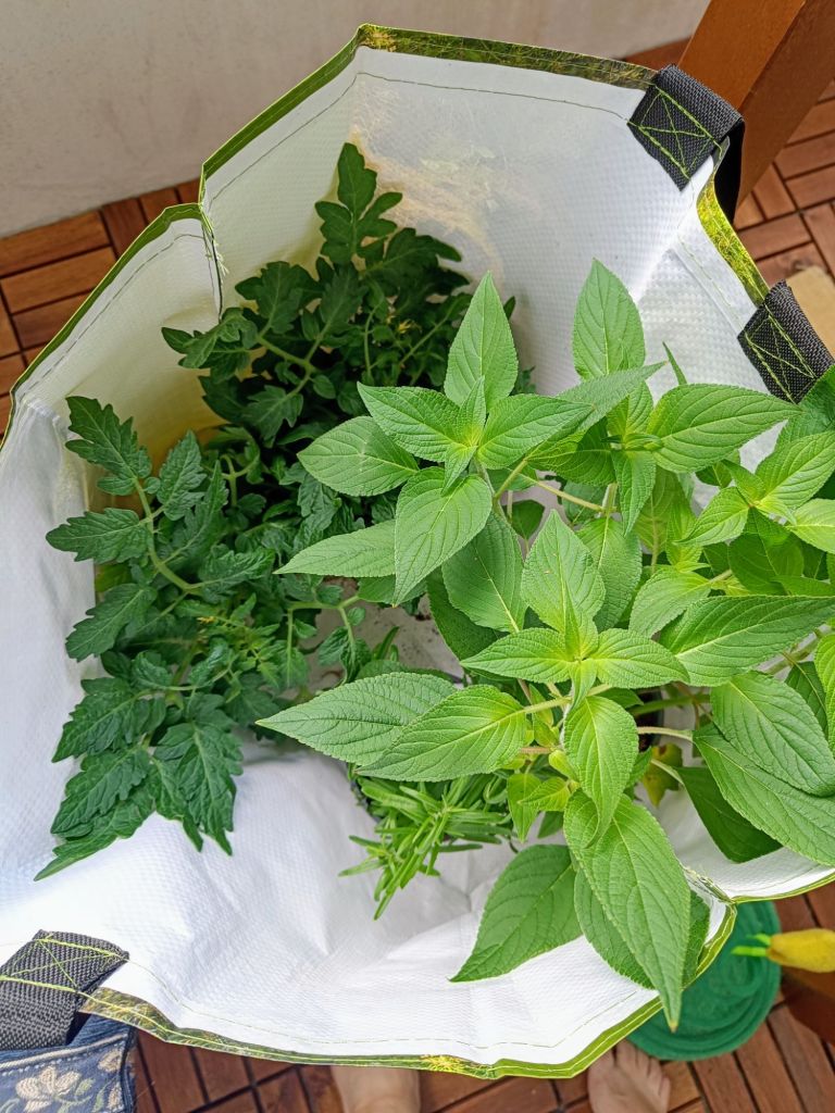 Jännittävien vihreiden kokeilujen osastolle menee ananassalvia (tuoksuu muuten oikeasti ananakselle, ja niin tuoksuu se oliiviyrttikin oliiville), jo viime vuoden viljelymaatikosta tuttu rosmariini, sekä yllättäen kaksi pienenpientä ruukkukirsikkatomaattia. Niille siellä olikin jo pieni kasvihuone valmiina.