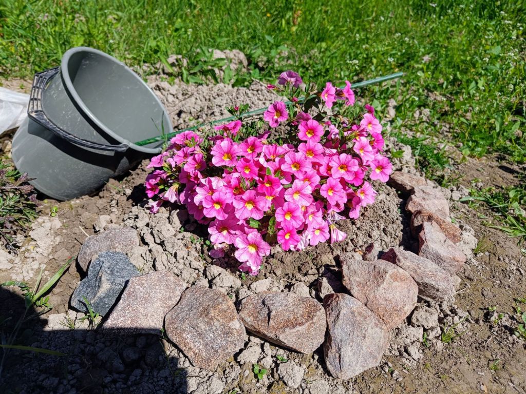 Ja koska palstan väri tässä vaiheessa on vielä harmaa, teki mieli joku muukin kukka sinne lisätä. Miljoonakelloja oli kaikenlaisissa sävyissä, kokeillaan siis mitä pitävät savimaasta.