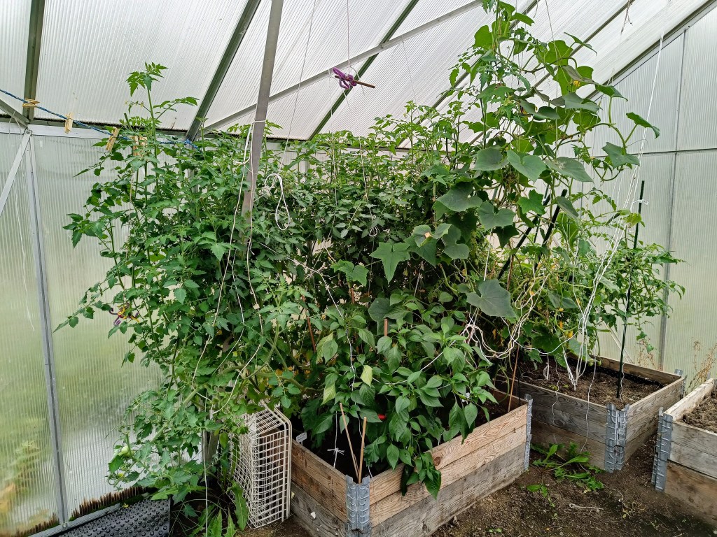 Kasvihuoneessa oli vielä aika virkeää viidakkoa, mutta kyllä siitä jo näki, että syyskuun loppu lähestyy. Tänään olikin aika kerätä loppusato kotiin kypsymään ja viedä kasvusto kompostiin. Kaksi kukkurallista kottikärryllistä siitä tuli.