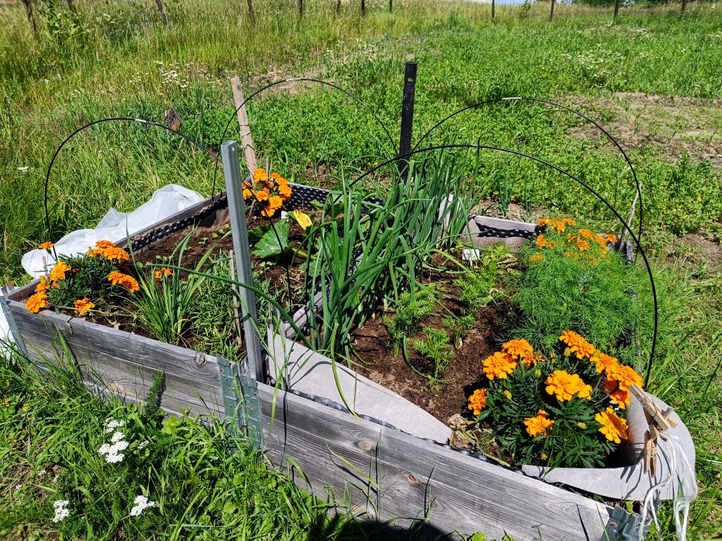 Tilli on ihan komeaa ja ensimmäiset saanee kohta kerätä kun tilapula näyttää iskevän, porkkanat kasvattavat lehtiään iloisesti, kesäkurpitsa saa ehkä kohta kukan auki (vähän ehkä epäilyttää nyt se sadon saaminen tästä…) ja sipulit ovat harson tukia korkeammat.