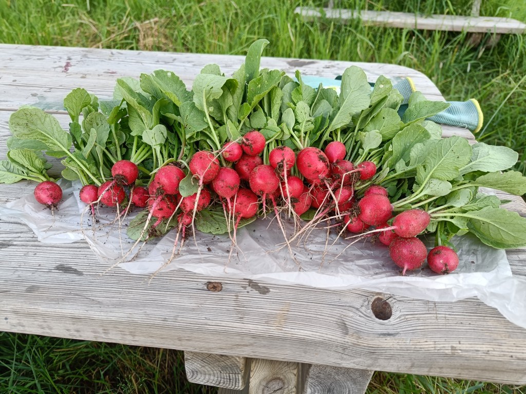 Silmiäni räpäytin ja retiisejä valmistui laatikon mitalta. Ovat aika polttelevia. Satokausikalenterin artikkeli sanoo, että kuivassa kasvanut retiisi maistuu liian tuliselta. Kotona väitelläänkin nyt siitä, ovatko nämä liian tulisia vai eivät. Kylvönauhasta kasvaneita, lajike Saxa 2. Nyt tilalle menivät Cherry Bellen siemenet.