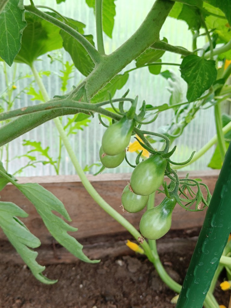 Keltaiset pikku tomaattimme ovat äärimmäisen herkullisia, mutta niitä on ollut äärettömän vaikea saada kypsäksi vaihtelevissa ulkoilmaolosuhteissa. Laji itse (Lemon Sherbet) oli kyllä ulkoilmaan sopiva, mutta ulkoilma ei tainnut olle sille sopiva. Ihan pikkasen kiinnostaisi kokeilla kasvattaa ensi vuonna parvekkeella.