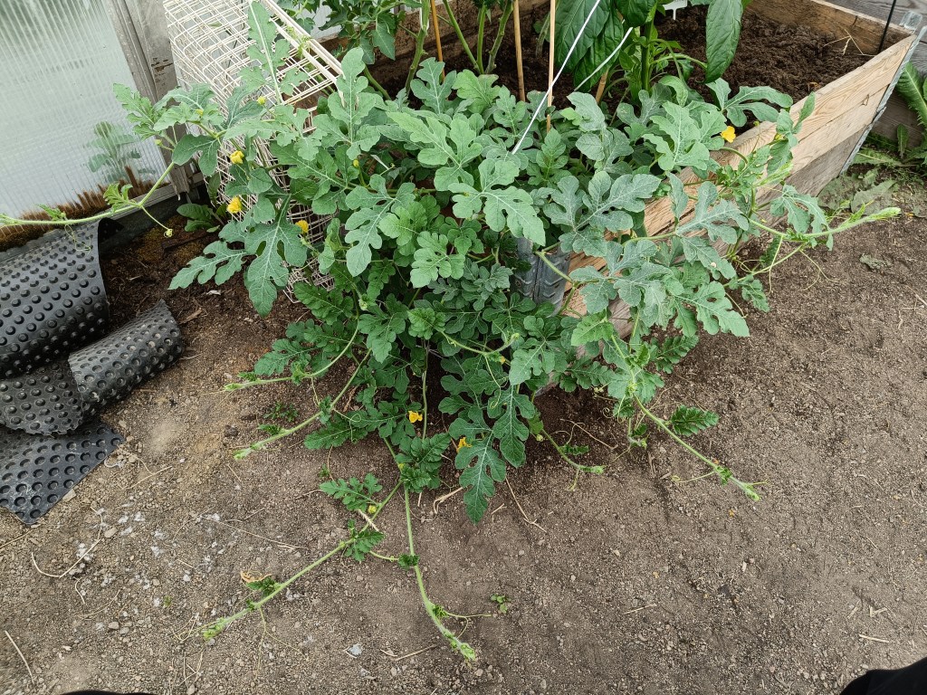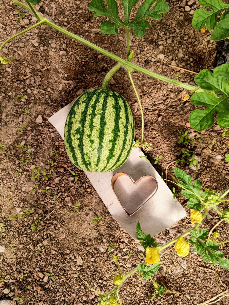 Vesimeloni voi hyvin. Hoitajaansa vähän haittaa, kun ei oikein tiedä milloin se on kypsä. Internettiä on taas luettu. Pitäisi olla keltainen ground spot (se kohta minkä päällä meloni lepää) ja kellastunut varsi (?) ja sen pitäisi koputtaessa kumista tietyllä tavalla (??) ja olla mattainen kiiltävän sijaan tai toisinpäin (???). Toivotaan parasta.