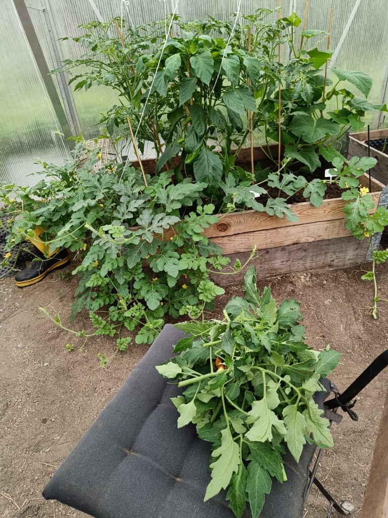 Esimerkiksi trimmata tomaateista varkaita ja poistaa vielä lisää alempia lehtiä. Nyt ollaan aika hyvässä mallissa.