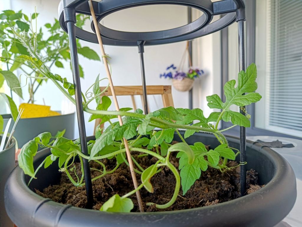 Yksi taimista jäi kotiin ja asuu nyt parvekkeella ruukussa tomaattituen ympärille kasvamassa. Melonia ei odotuksissa ole mutta kukkaset olisi kivoja tulevassa pikkuköynnöksessä.